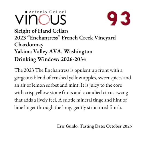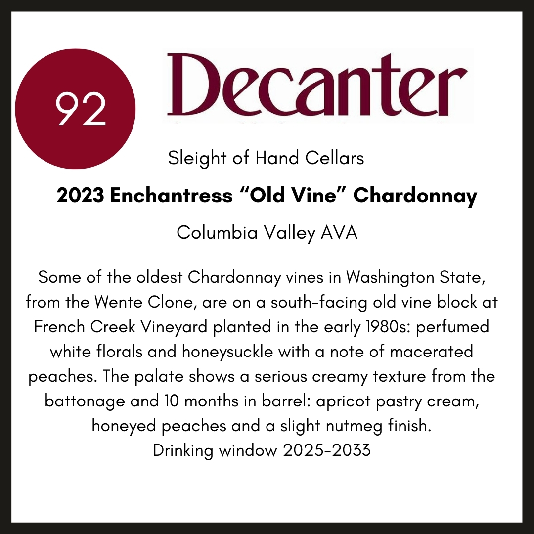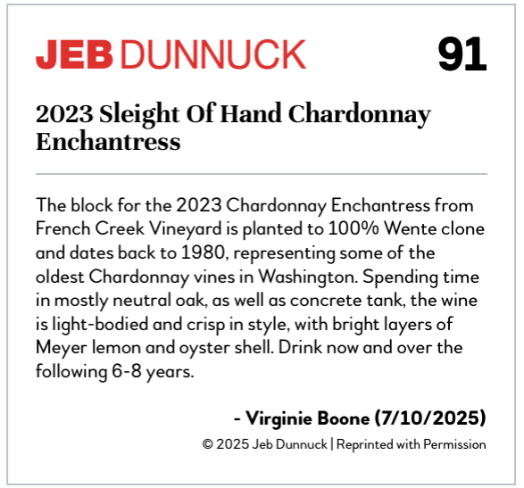 The 2023 Enchantress Chardonnay comes from 40+ year old French Creek Vineyard, in the southeast part of the Yakima Valley. Gorgeously ripe, yet restrained, the 2023 Enchantress shows notes of Meyer lemons, freshly picked green apples, a touch of apricot, and wet stone. Aged for 11 months in only 10% new French oak, it’s both elegant and refined, and an age-worthy example of this amazing varietal. As always, it is best enjoyed with great friends and great music!